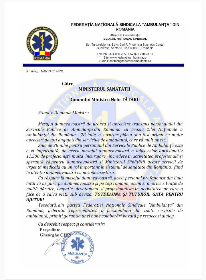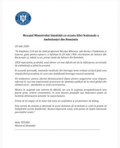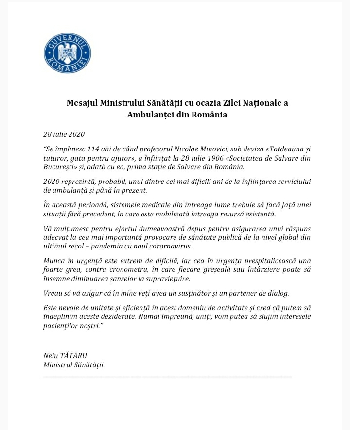 28 iulie – Ziua Națională a Ambulanței, Mesajul Ministrului Sănătății